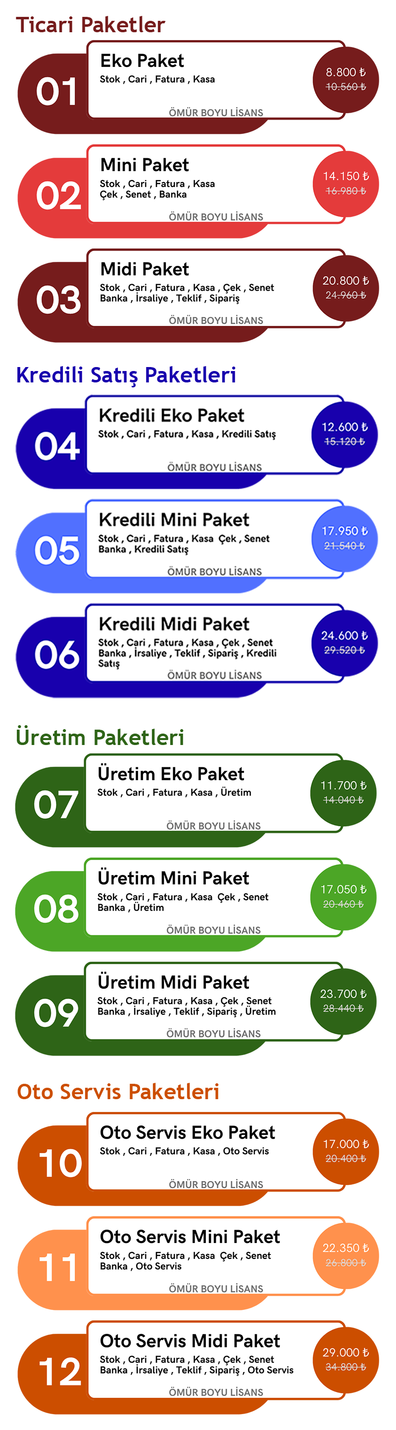 - İlave ek kullanıcı alımlarında (Efatura,Oto Servis hariç) 1+1 için %30 ve sonraki her kullanıcı için %10 fiyat farkı ilave edilecektir.